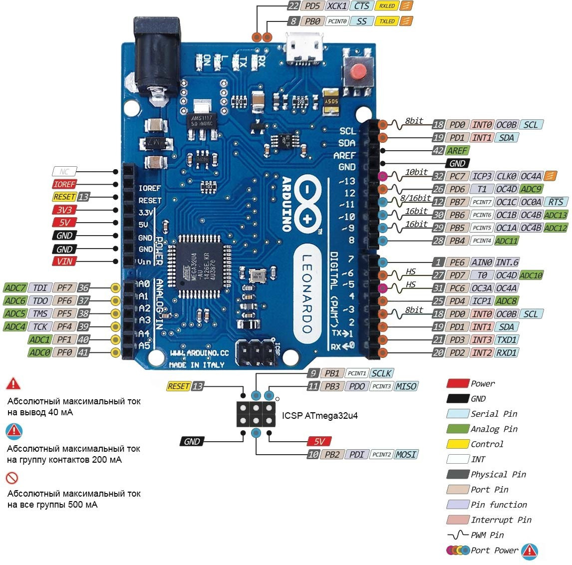 Энергосхема LEONARDO обеспечивает дополнительный уровень защиты от перегрузок и спроектирована таким образом, чтобы обезопасить USB-порт от сверхтоков. Помогает ей в этом самовосстанавливающийся предохранитель. В случае, когда плата потребляет ток более 500 мА, предохранитель разрывает цепь основного питания, обесточивая все компоненты платы и снова возвращает питающее напряжение, когда ток будет снижен до допустимого порогового значения или устранено короткое замыкание.