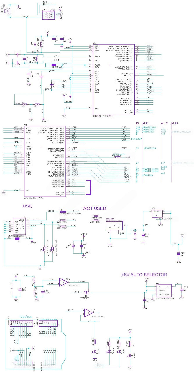 • SPI (последовательный периферийный интерфейс): размещен в разъёме ICSP. При обмене данными между двумя устройствами главный из них управляем процессом. По линии SS (вывод 8 микроконтроллера) определяется начало и конец сеанса передачи данных. MOSI (вывод 10 микроконтроллера) - выход главного, MISO (вывод 11 микроконтроллера) - вход главного. Обе линии подключаются ко второму устройству по схеме MOSI->MISO и MISO->MOSI. SCK (SCLK, вывод 9 микроконтроллера) задействован генерацией главным устройством импульсов синхронизации и называется шиной тактирования. Пожалуйста, не путайте выводы микроконтроллера с номерами пользовательских цифровых выводов.
