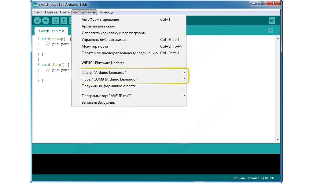 В меню редактора Инструменты (Tools)/Плата (Boards) выберите из раскрывающегося перечня ваш микроконтроллер ARDUINO LEONARDO. Следующим шагом в меню Инструменты (Tools)/Порт (Port) укажите созданный ранее виртуальный COM-порт. Нумерация портов может быть абсолютно разной на каждом компьютере (COM2, COM3 и так далее). Как это выглядит на пример на ОС Windows: