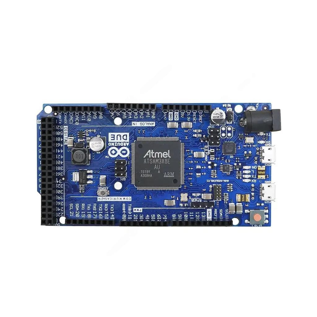 ARDUINO DUE — старшая и достаточно мощная модель в семействе плат ARDUINO. Именно в ней, в качестве основного управляющего контроллера, впервые был реализован высокотехнологичный 32-битный ARM-процессор ATSAM3X8E-AU (AT91SAM ARM) со встроенным модулем защиты памяти. Предоставила микроконтроллер корпорация Atmel, широко известная среди производителей микрочипов. Такой смелый шаг по переходу с одного типа процессоров на другой позволил инженерам ARDUINO увеличить вычислительную мощность аппаратной платформы, полностью доступную для нужд пользователей. Тактовая частота 84 МГц и 32-битная архитектура, которыми обладает микроконтроллер, позволяют вычислять большинство операций над целыми числами в 4 байта за один такт. Процессор максимально совместим со средой разработки ARDUINO IDE и поддерживает большинство подключаемых библиотек и функций. Перенос ваших программ с других ARDUINO-платформ не составит особого труда. Модуль DUE, при верном подключении, прекрасно работает в сочетании с аналогичными платами, построенными на микроконтроллерах ATmega.