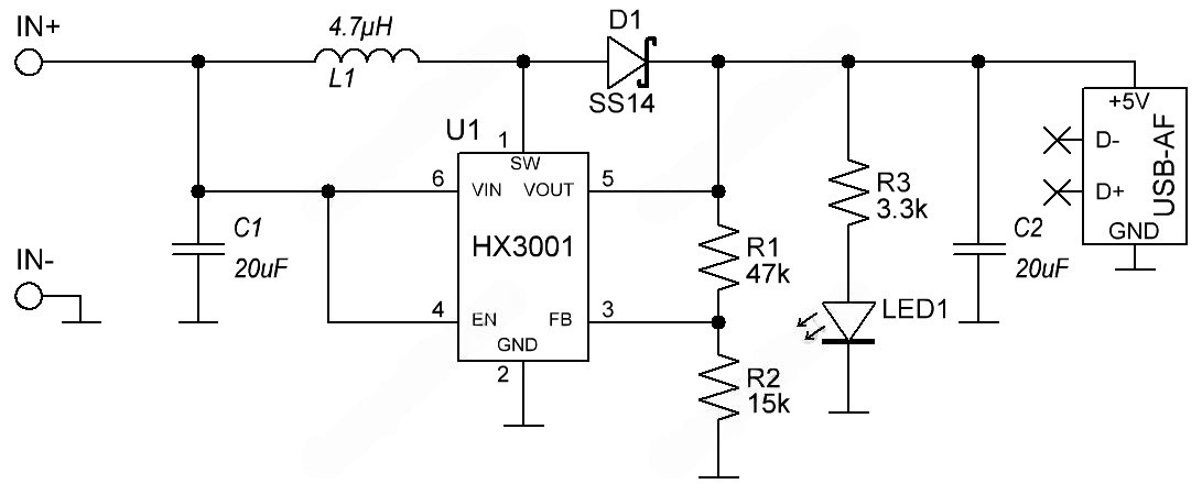 Повышающий регулятор напряжения HX3001 HEXIN в корпусе SOT23-6 содержит внутри контроллер широтно-импульсной модуляции (ШИМ), управляющий переключением встроенного силового МОП-транзистора на частоте 1.4 МГц. Регулятор HX3001 с маркировкой 4X-NXH на корпусе функционирует в широком диапазоне низковольтного напряжения, в роли источника исходного напряжения для HW-105 может быть любой элемент питания с выходным напряжением от 1 до 4.5В и током до 1А. Неуправляемый регулятор HX3001 HEXIN повышает любой уровень входного напряжения в пределах указанного интервала до стабильных 5В, работает в нагрузках с силой тока до 0.5А.