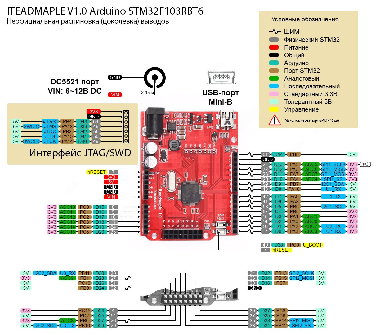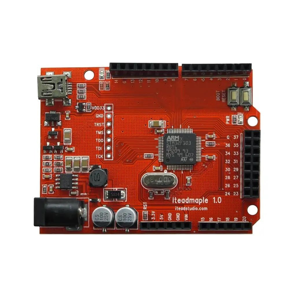 Контроллер Iteadmaple STM32 Cortex-M3 основан на идеях уникального коммерческого проекта Leaf Maple от Leaflabs (Funduino), и объединяет классический стиль Arduino с вычислительной мощностью STM32. Плата с программируемым контроллером Iteadmaple STM32 обладает схожими с популярной моделью Arduino UNO R3 физическими размерами, имеет одинаковую компоновку базовых аналого-цифровых портов за ислючением отсутствующего порта ICSP (SPI), и полностью совместима со многими существующими на рынке надстраиваемыми модулями расширения для Ардуино. В модуле Iteadmaple V1.0 используется высокопроизводительный процессор ARM STM32F103RB Cortex-M3, по характеристикам и возможностям с лихвой превосходящий ключевые показатели 8-битных AVR чипов семейства Arduino. Контроллер функционирует на частоте 72 МГц, располагает увеличенным объёмом памяти ОЗУ 20КБ/ПЗУ 128КБ. Отличается внушительным количеством периферии — на плате представлено 35 цифровых портов ввода/вывода общего назначения GPIO. Среди них - 15 с поддержкой ШИМ, 15 каналов АЦП, нативный порт USB 2.0 для питания и программирования, три аппаратных USART, по две шины I2C/SPI. В память чипа STM32 фабрично прошит DFU-загрузчик и USB-загрузчик, дополнительный внешний программатор не требуется. Плата Iteadmaple V1.0 оснащена стабилизатором напряжения питания и разъёмом отладочного интерфейса JTAG/SWD.