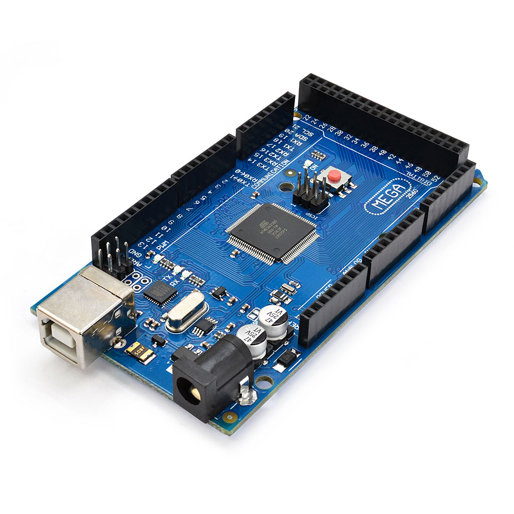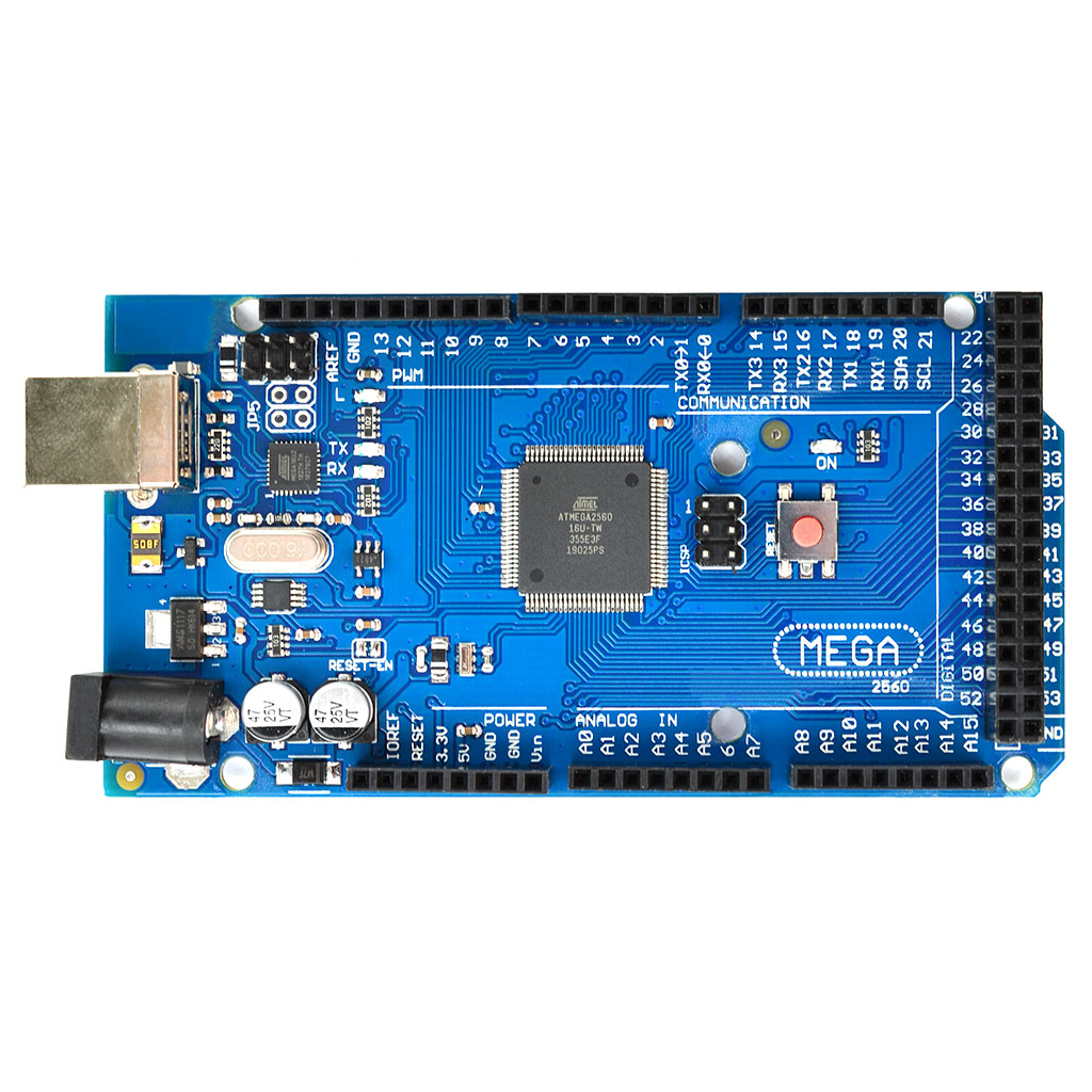 Arduino Mega 2560 - это оценочная плата разработчика приложения, построенная на микроконтроллере AVR ATmega2560 с тактовой частотой 16МГц, втроенной памятью ОЗУ 8Кб, ПЗУ 256Кб и EEPROM 4Кб. Модуль содержит 70 физических портов (контактов) ввода/вывода для передачи/приёма цифровых и аналоговых сигналов. В это число входят 16 аналоговых контактов и 15 контактов с поддержкой ШИМ-модуляции. На плате распаян чип Atmega16U2 преобразователя USB/UART-TTL, который используется для программирования и отладки Mega2560 через USB-порт. Ранее его место занимал более медленный в работе Atmega8u2.
