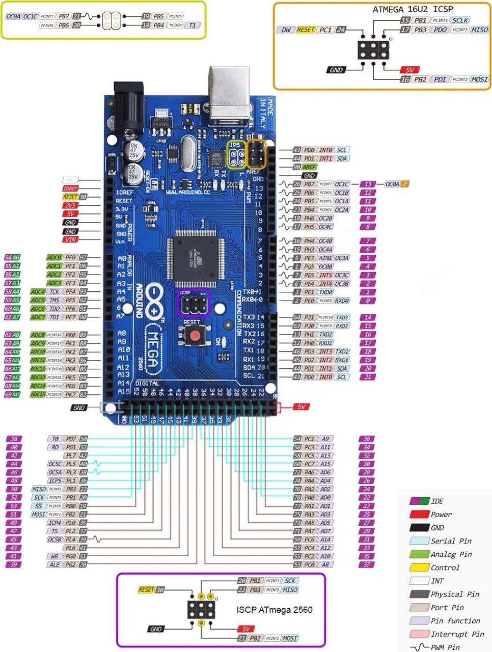• ICSP — 6-пиновый коннектор, предназначенный для внутрисхемного программирования микроконтроллера прямо в схеме устройства, исключающий необходимость предварительного демонтажа чипа. Коннектор объединяет выводы питания, управления и интерфейс SPI. Для прошивки используются внешние ICSP-программаторы. MEGA2560 располагает двумя коннекторами ICSP, под одному для ATmega2560 и ATmega16U2.