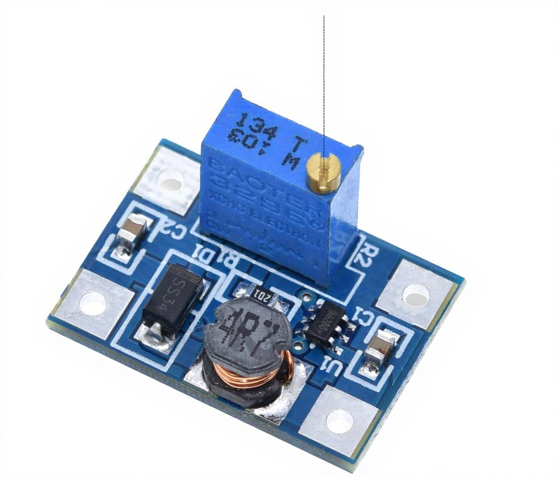 Уровень выходного напряжения в преобразователе SX1308 настраивается путём механического вращения винта переменного сопротивления 10кОм в синем пластиковом корпусе. Регулировка выполняется вращением винта многооборотного механизма подстроечника: для увеличения — по направлению, обратному ходу часовой стрелке, и для уменьшения — по часовой стрелке. Регулировка выходного напряжения в диапазоне от минимального 2В до максимального 28В потребует около 25 ± 3 полных оборотов винта вокруг своей оси. Конечное значение выходного напряжения регулятора SX1308 в процессе настройки определяется замерами потенциала выводов произвольным вольметром-мультиметром.
