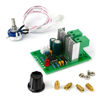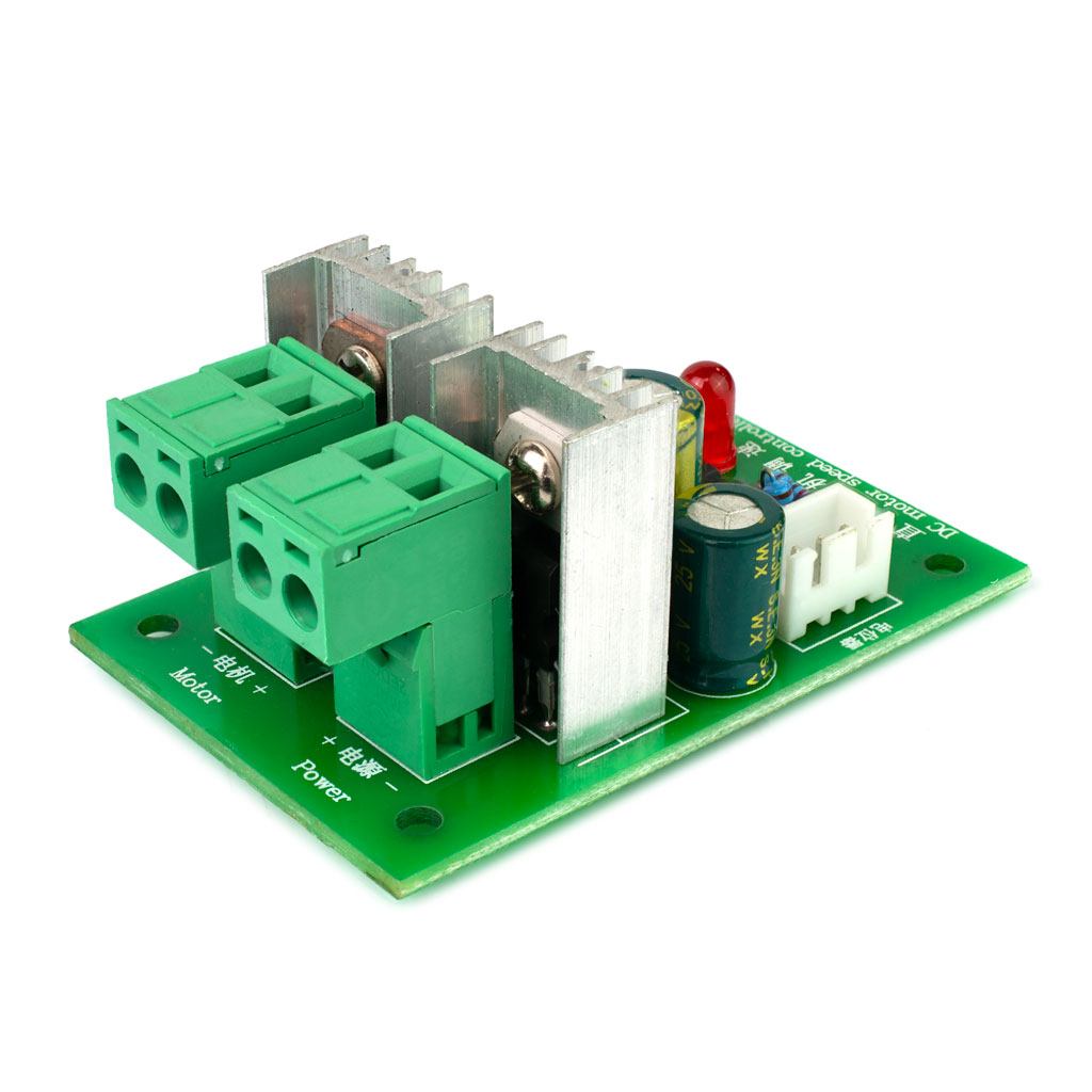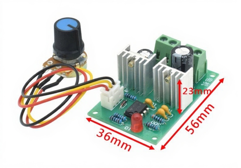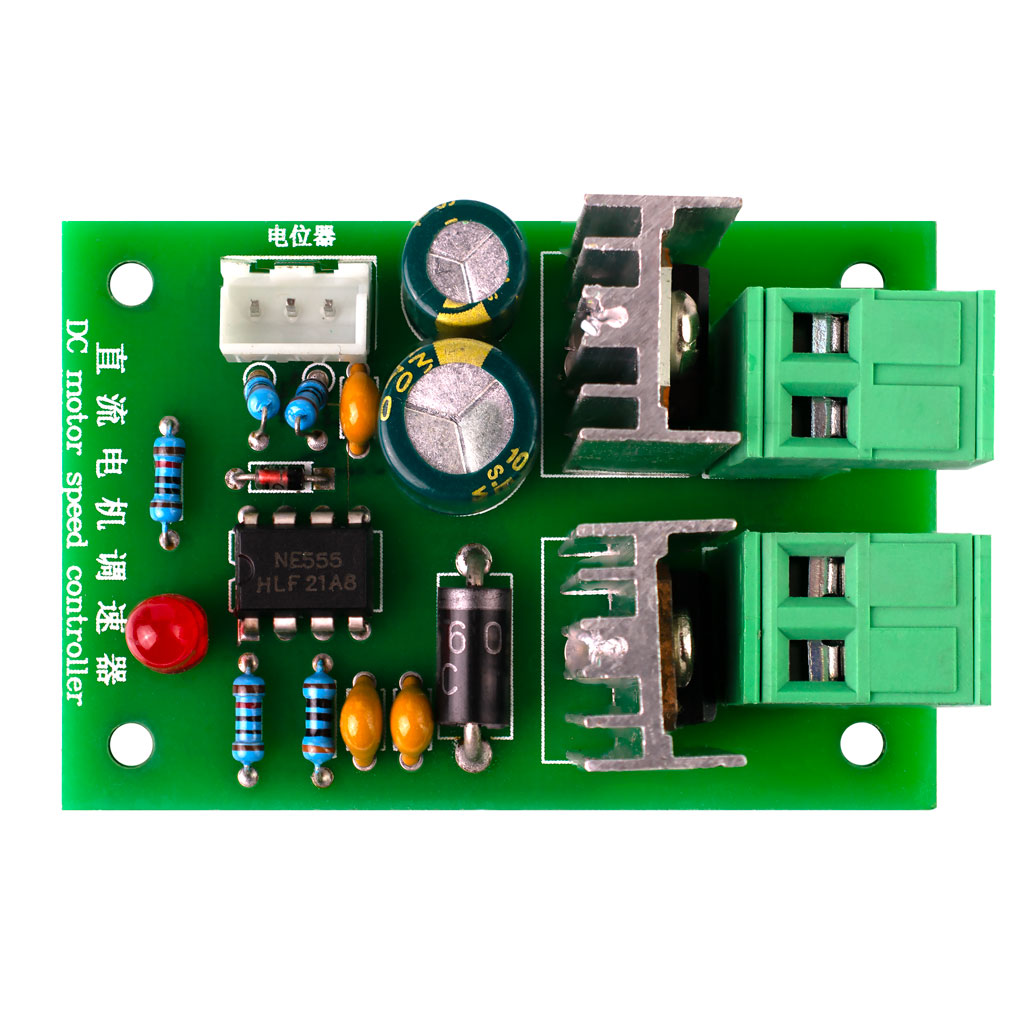 Компактный регулятор оборотов для коллекторного (щёточного) двигателя постоянного тока с выносным элементом ручного управления. ШИМ-решулятор работает в широком диапазоне напряжения 12~36В постоянного тока, используется метод широтно-импульсной модуляции (ШИМ) сигнала выходного напряжения. Максимальный допустимый ток нагрузки обозначен величиной 3А. В режимах пиковой загрузки может потребоваться дополнительное усиленное воздушное охлаждение модуля. Контроллер скорости мотора построен на широко распространённой микросхеме аппаратно программируемого таймера NE555P, питающейся от встроенного в плату 9-вольтового стабилизатора L7809.