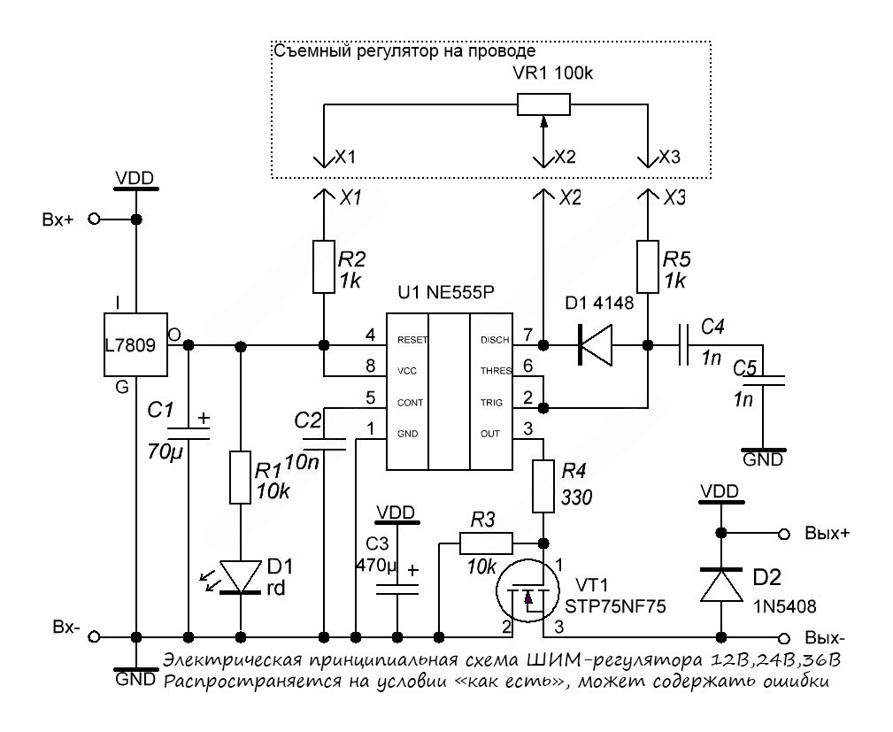 Электрическая принципиальная схема ШИМ-регулятора скорости мотора 12В,24В,36В 3А NE555