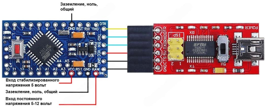 Малый размер, к которому так стремились создатели, не позволил разместить на плате USB-порт и связующий между портом программирования и микроконтроллером преобразователя последовательных сигналов. Организовать USB-интерфейс для подключения Pro Mini к компьютеру позволяет преобразователь интерфейсов USB/UART-TTL 5В. К ним относятся конверторы с микросхемами FT232, CH340, CP2102, CP2104, PL2303 и другие совместимые. К USB-порту конвертор подключается соответствующим USB-кабелем. Подключение конвертора к группе контактов программирования осуществляется по схеме GND->GND, VCC->VCC, RX->TX, TX->RX, DTR->DTR (пример соединения представлен на рисунке выше).