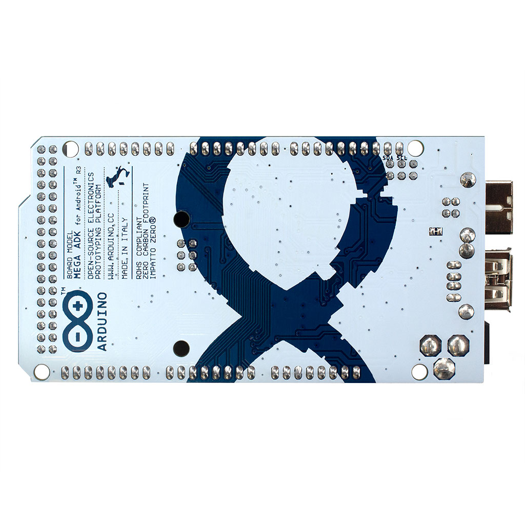 Arduino Mega ADK R3 на базе процессора ATmega2560, с USB портом для подключения периферии. USB построен на MAX3421, 54 цифровых и 16 аналоговых выхода, 4 аппаратных UART, частота: 16 МГц, ICSP порт и кнопка сброса. Серийный порт построен на базе Atmega8U2 как и у UNO и MEGA, все USB порты защищены от КЗ.
