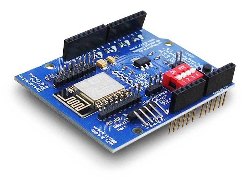Модуль WiFi ESP8266 на базе модуля ESP-12E, совместим с полноразмерными Arduino UNO, MEGA. Имеет 4 переключателя выбора режимов работы, индикацию режимов, дополнительный отладочный UART порт. Поддерживает дальнейшее расширение, имея выводы с верхней и нижней стороны платы. Стабилизатор питания 3.3 В встроен, максимальное входное напряжение 5В. Внешнего питания нет. Размеры без контактов: 68.6х54х10.5мм