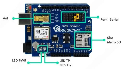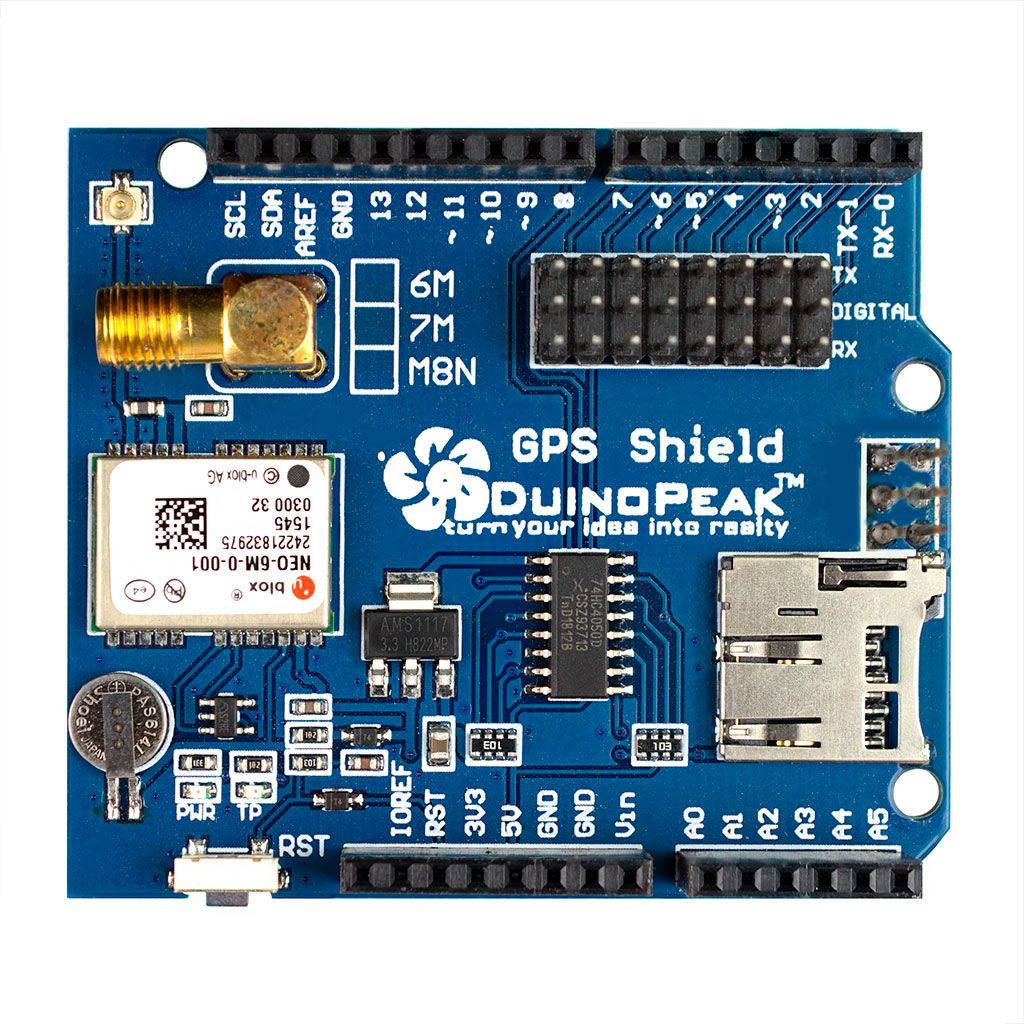 GPS Logger Shield предоставляет вашему Arduino доступ к модулю GPS, разъему для карты памяти microSD и ко всем другим периферийным устройствам, которые вам понадобятся, чтобы превратить ваш Arduino в регистратор с отслеживанием положения, скорости и высоты. Шилд основан на GPS-модуле NEO-6M — 50-канальном GPS-приемнике с архитектурой MediaTek MT3339 и частотой обновления до 5 Гц. GPS-модуль передает данные о местоположении через последовательный порт UART-TTL. Данные затем можно записать на карту microSD и/или использовать для других целей.