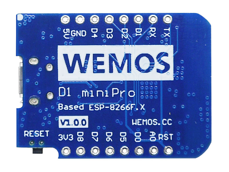 Микроконтроллер D1 Mini Pro WeMos полностью поддерживает работу на прошивке, включающей в себя интерпретатор NodeMCU скриптового языка Lua, выполняющего команды наподобие АТ инструкций. Загрузка новой прошивки в память ESP8266 выполняется через порт USB или по воздуху. Причём загружаемая прошивка может быть как оригинальной, так и модифицированной с применением инструментов разработки ПО (SDK). Либо вообще быть написанной самостоятельно на языке С/С++.