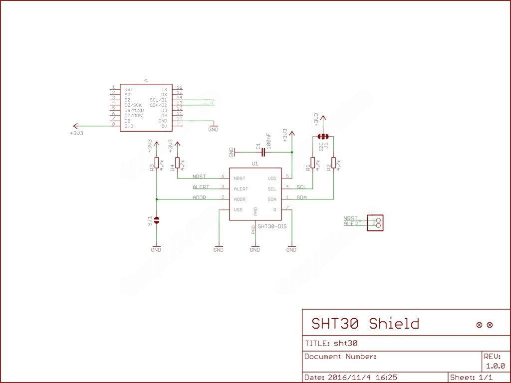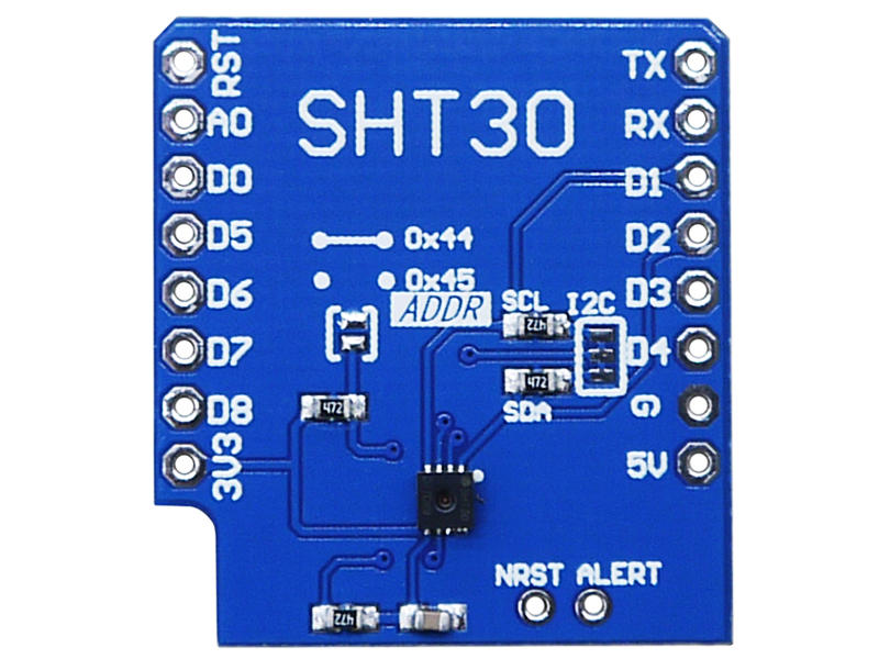 Связь между температурным датчиком WeMos SHT30 и внешним микроконтроллером реализована по последовательной ассиметричной шине I2C/IIC. Линия передачи данных размещена на контакте D2 (SDA), линия тактирования сигнала - на контакте D1 (SCL). Расположенная на лицевой стороне платы перемычка SJ1 (ADDR) позволяет подключать в одну шину одновременно до двух датчиков с уникальным программным адресом. По умолчанию, перемычка находится в незамкнутом состоянии и модуль имеет I2C-адрес 0х45. В замкнутом положении адрес изменяется на 0x44.