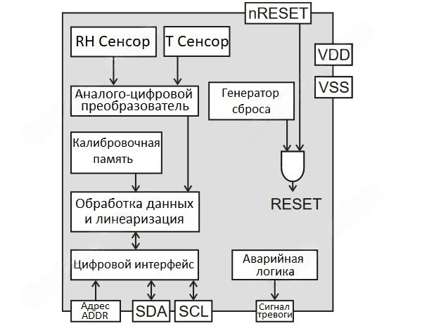 Высокотехнологичный интеллектуальный датчик SHT30 производится по запатентованной микросенсорной технологии СMOSens SENSIRION, сочетающей в себе миниатюризацию компонентов, интеграцию усилителя сигналов и аналого-цифрового преобразователя, добавление методов линеаризации и температурной компенсации с элементами самоконтроля и калибровки. Блок-схема WeMos SHT30: