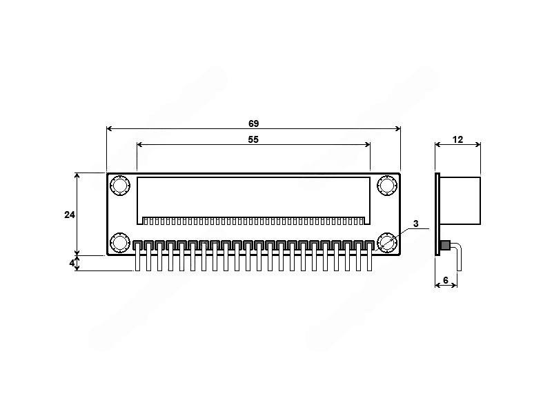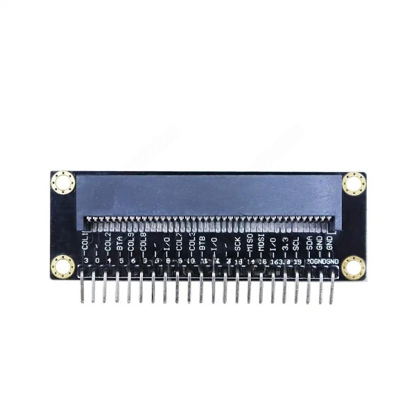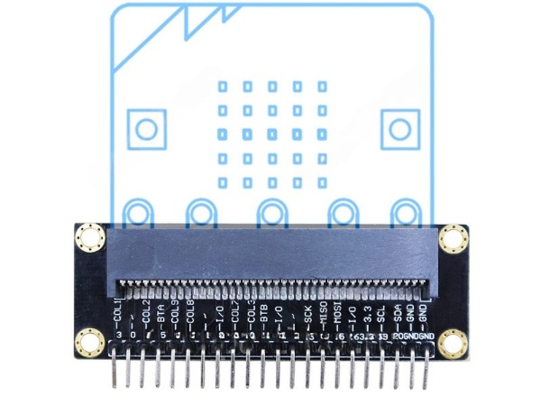 Расположенный по нижнему краю, однорядный набор из 22 штырьевых контактов в точности дублирует все стандартные выводы базового бокового разъёма EDGE/GPIO микроконтроллера Micro bit, за исключением двух выводов +3.3В и одного вывода GND. Для каждого контакта присутствует визуальная текстовая маркировка с его функциональным назначением.