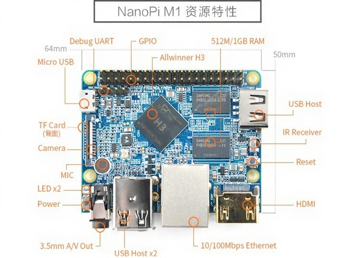 Микрокомпьютер NanoPi M1 — это одноплатный компьютер на процессоре Allwinner H3 от компании FriendlyARM, в который входят четыре вычислительных ядра Cortex A7 с тактовой частотой до 1,2 ГГц. с открытым исходным кодом. Он может работать под управлением Android 4.4, Ubuntu, Debian. Он имеет 512 МБ DDR3 оперативной памяти SDRAM. Также этот миникомпьютер оснащен графическим ускорителем Mali-400MP2, который позволяет декодировать 4К-видео формата H.265/HEVC с частотой воспроизведения до 30 кадров в секунду и поддерживает microSD карты памяти ёмкостью до 64 гигабайт.