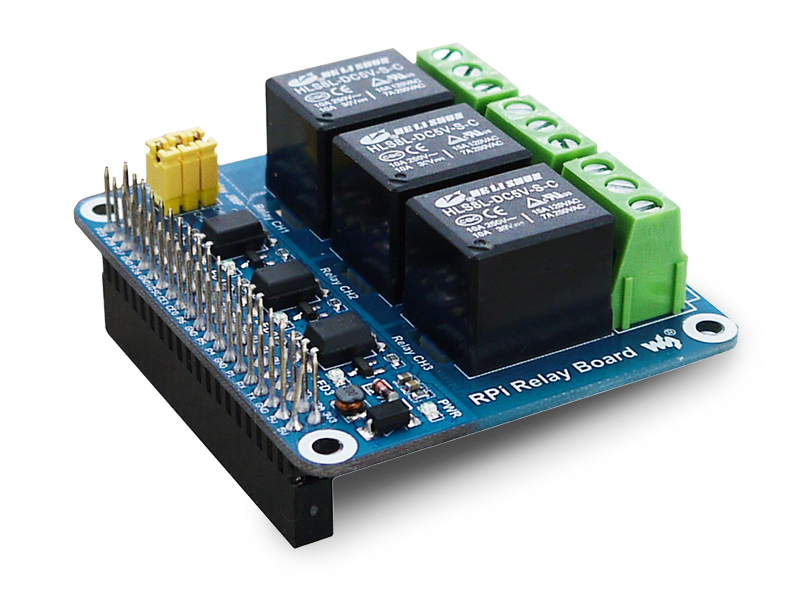 Модуль с реле для Raspberry PI, 3 канала, питание 5В. Интерфейс: GPIO, опторазвязка, световая индикация, ток коммутации: 5А.