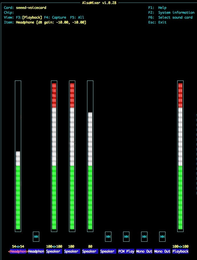 Перед началом, воспользуйтесь клавишей F6 для выбора устройства seeed-2mic-voicecard. Клавиши со стрелками влево и вправо позволяют выбрать канал или устройство, стрелки вверх и вниз регулируют громкость текущего выбранного устройства. Выход из программы осуществляется нажатием клавиш ALT+Q или ESC. Дополнительная информация.