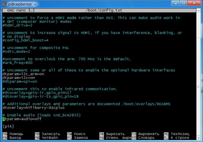Выключите интегрированный звуковой адаптер Raspberry Pi, найдя строку и изменив её значение