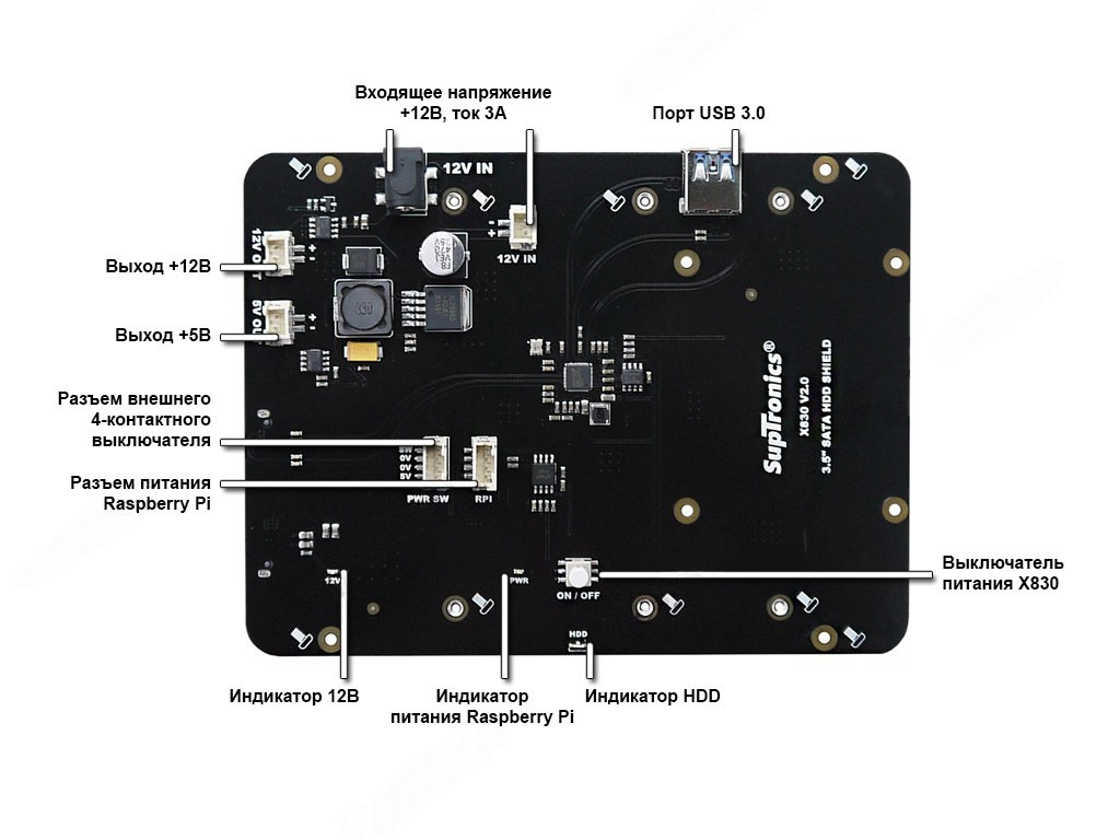 Плата расширения SupTronics X830 ориентирована на создание функционально готового, полноценного решения на базе мини-компьютера Raspberry Pi. Она предоставляет возможность подключения 3,5-дюймовых жёстких дисков с интерфейсом передачи данных SATA, наиболее часто устанавливаемых в компьютерах или независимых внешних накопителях. Диски для хранения информации могут быть совершенно произвольного размера (ёмкостью), не превышающим 14 ТБ. В комплектацию платы X830 входят все элементы соединения и крепления аппаратного оборудования, необходимые для быстрой сборки устройства.