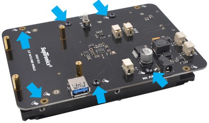 - Поместите четыре стойки М2.5х12мм в отверстия верхней стороны платы и закрепите их болтами М2.5х6мм. К этим стойкам далее крепится Raspberry Pi.