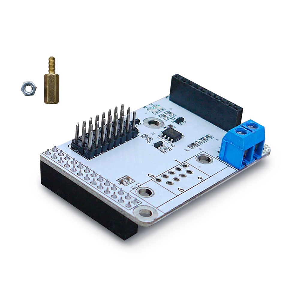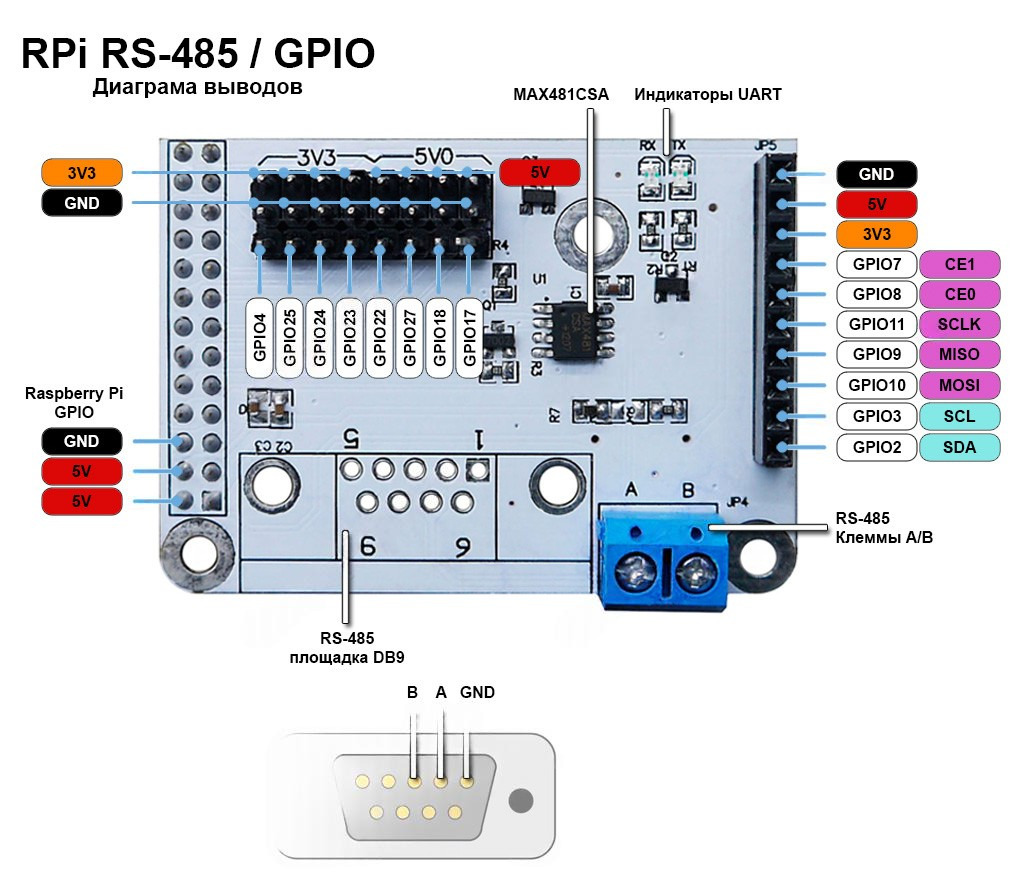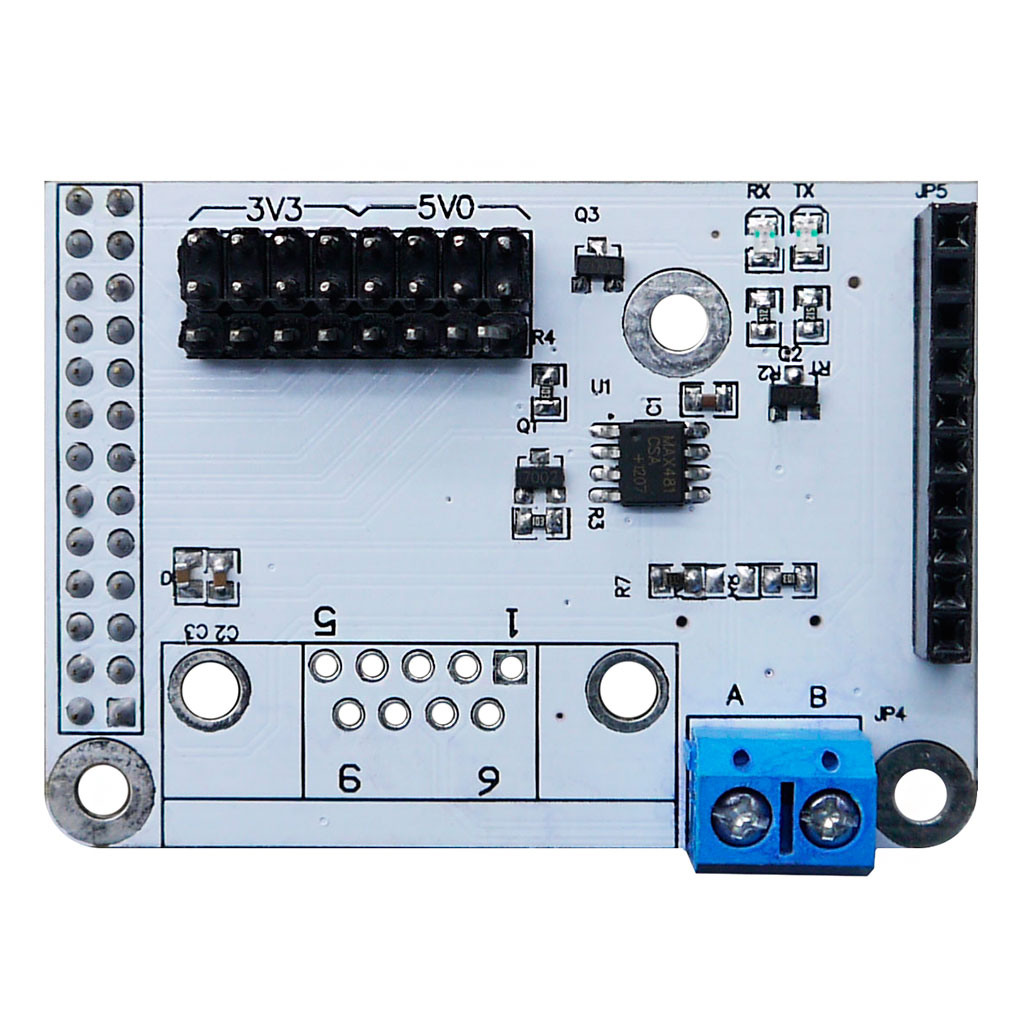 Приёмопередатчик MAX481, интегрированный в плату расширения Raspberry Pi RS485/GPIO Expansion Board, способен работать в двухпроводном полудуплексном режиме — в один момент времени информация либо передаётся, либо принимается. Перенастройка приёмопередатчика в соответствующий режим работы требует кратковременной задержки для каждой стадии обмена данными. Модуль оснащён двухконтактной винтовой клеммой с соответствующей маркировкой сигнальных линий А и В, предназначенной для коммутации с внешними устройствами по интерфейсу RS-485. Рядом с клеммой расположена свободная площадка под самостоятельную припайку разъёма DB9. Выведенные на площадку контакты дублируют клеммную колодку. Встроенная светодиодная индикация интерфейса UART обеспечивает визуальный контроль за процессами трансляции сигнала приёма или передачи.