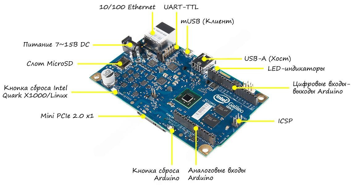 Невероятная по современным меркам коллаборация популярных технологий от техногиганта Intel, всемирно известной цифровой платформы Arduino и сообщества разработчиков ПО на основе открытого кода Linux представлена в новейшем модуле Intel Galileo. Эта высокоинтегрированная плата разработчика в одном компактном решении предоставляет невиданные ранее возможности и функционал для разработки и создания широкого спектра уникальных приложений домашней или промышленной автоматизации и роботехники. Intel Galileo первого и второго поколений, обе модели которого появившиеся практически в одно время и в малой степени отличающиеся друг от друга, спроектированы на мощном процессоре Intel® Quark X1000 — однокристальной системе на чипе (SoC) в классе 32-разрядный процессор Intel® Pentium®. Нативные средства ввода-вывода оригинального Intel® Quark X1000 обеспечивают коммуникационную способность Intel Galileo с внешней периферией. Intel Galileo функционирует на ядре операционной системы Yocto Project Poky Linux и поддерживает её старшие версии с увеличенным стеком приложений. Arduino-сертифицированный Intel Galileo обладает полной аппаратной, программной и физической совместимостью со множеством расширений Arduino UNO R3.