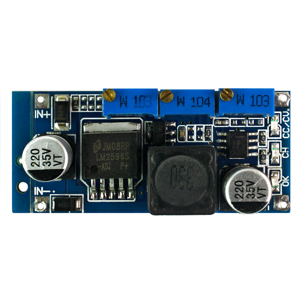 Преобразователь постоянного напряжения DC-DC на LM2596 понижающий, выбор напряжения и тока - регуляторами , Вх. напр. - 3,5-40 В, Напр. вых - 4-40 В, Ток регулируемый - макс. 2 А (3А с радиатором), размеры 22*45 мм, Цвет платы - синий. Предназначем для работы в качестве LED драйвера или для зарядки Li-ion аккумуляторов. Метод заряда CC-CV.