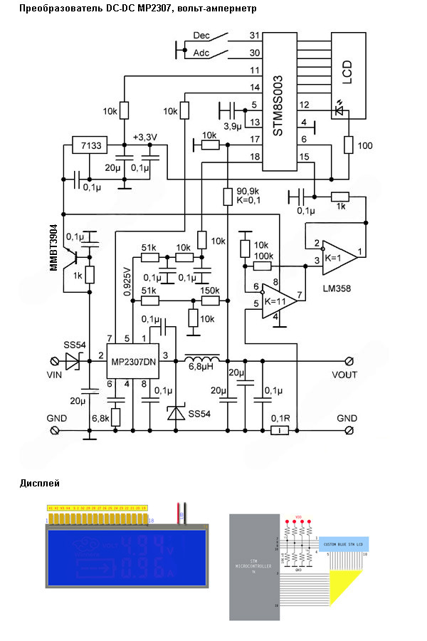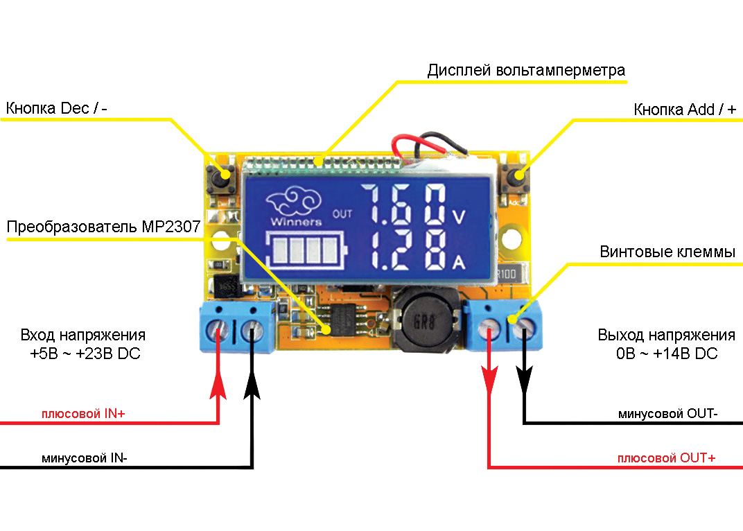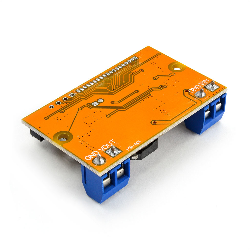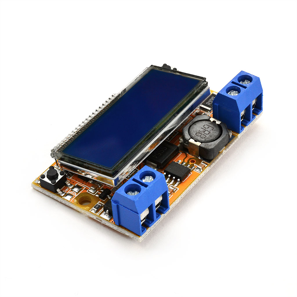 Преобразователь понижающий DC-DC 5*23/0-16,5 В ток 3А, с цифровым LCD дисплеем и кнопочным управлением. Запоминает последнее выставленное напряжение, КПД преобразования: 95%, защита от переполюсовки отсутсвует. Размеры: 50*30*12 мм.