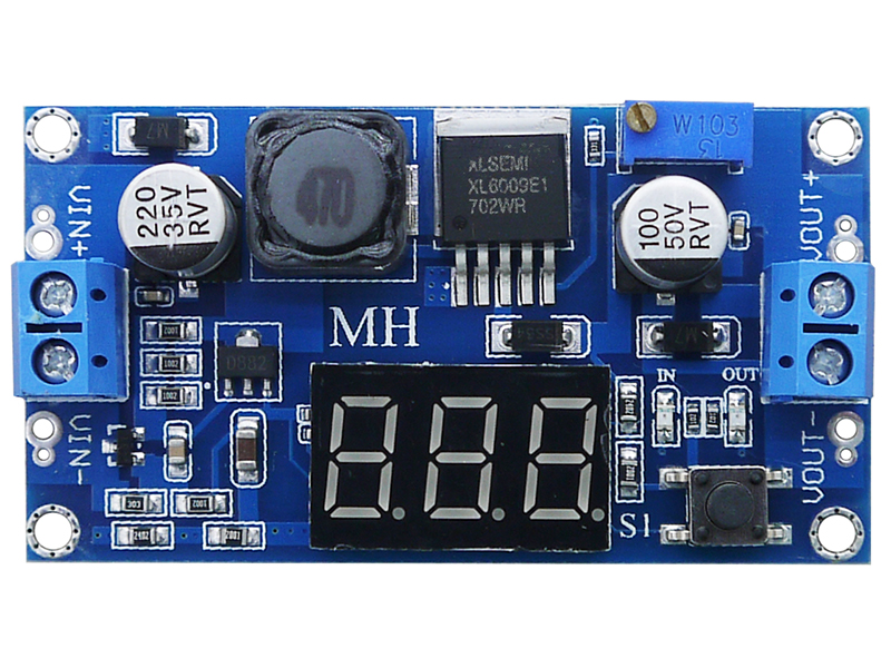 Преобразователь постоянного напряжения DC-DC на XL6009 повышающий с встроенным вольтметром, выбор напряжения - регулятором , Вх. напр. - 4.5-32 В, Напр. вых - 5-52 В, Ток - до 4 А, размеры 36*66*13 мм, Цвет платы - синий.