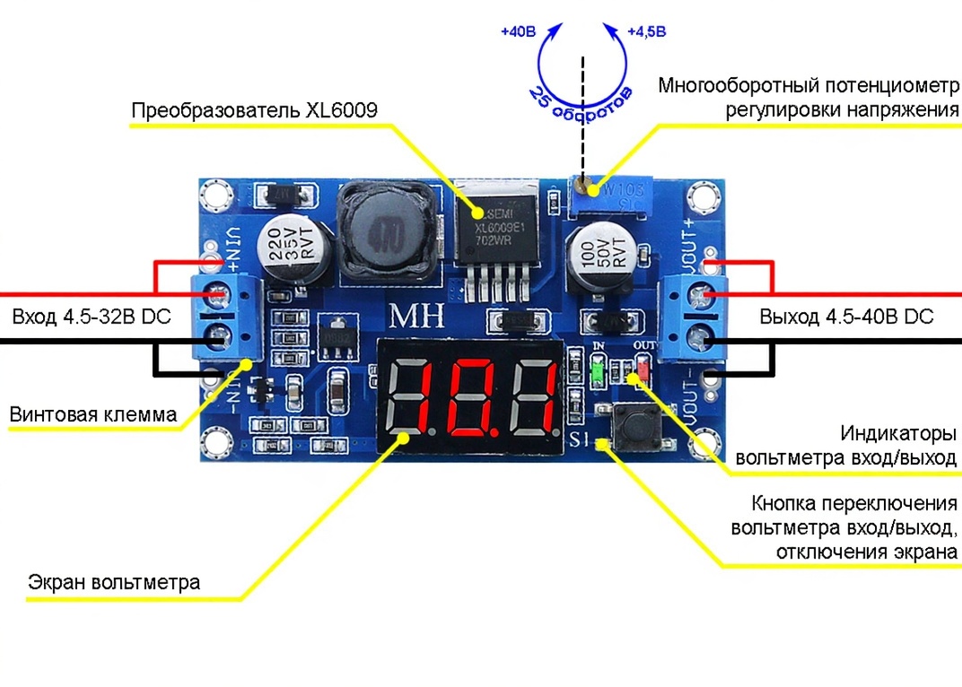 Преобразователь постоянного напряжения DC-DC на XL6009 повышающий с встроенным вольтметром, выбор напряжения - регулятором/ Вх