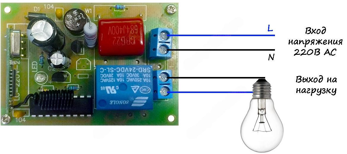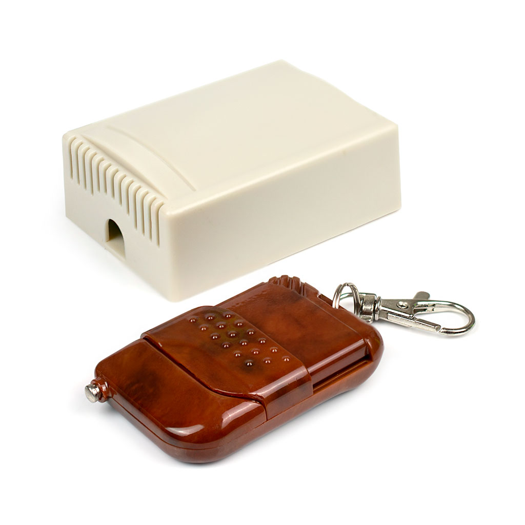 Модуль дистанционного управления 1 канальный с 2-кнопочным пультом 433МГц. Релейный блок работает от сетей с напряжением 220В переменного тока, позволяет без дополнительной коммутации запитывать любую нагрузку резистивного или индуктивного характера мощностью не более 1000Вт и 400Вт соответственно. Релейный блок имеет встроенный электромеханический прерыватель одной из силовых линий между входом и выходом, управляемый дистанционно на расстоянии до 50м на открытой местности. Частота радиоканала приёмо-передатчика кодированного сигнала лежит в диапазоне 433МГц.