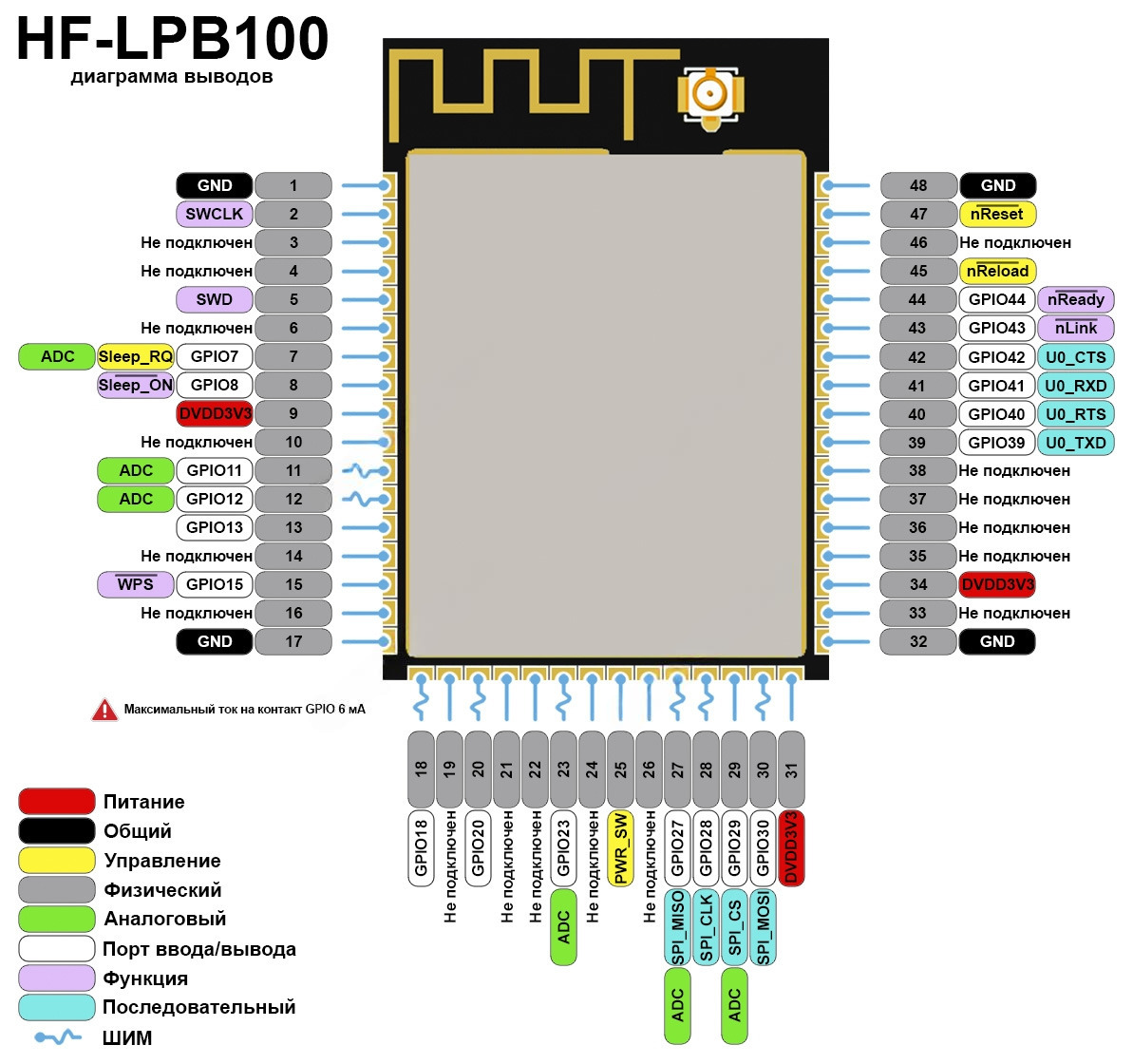 WiFi модуль LPB100-B с внешней антенной 2.4ГГц, ARMCortexM3UART,SPI,PWM,GPIO. Режимы: STA/AP/STA+AP. Сетевые протоколы: IPv4,TPC,UDP,FTP,HTTP. Питание 3-3.6В, макс.ток 200мА. Поддержка Andoid/iOS. Размеры 23.1х32.8х2.7мм