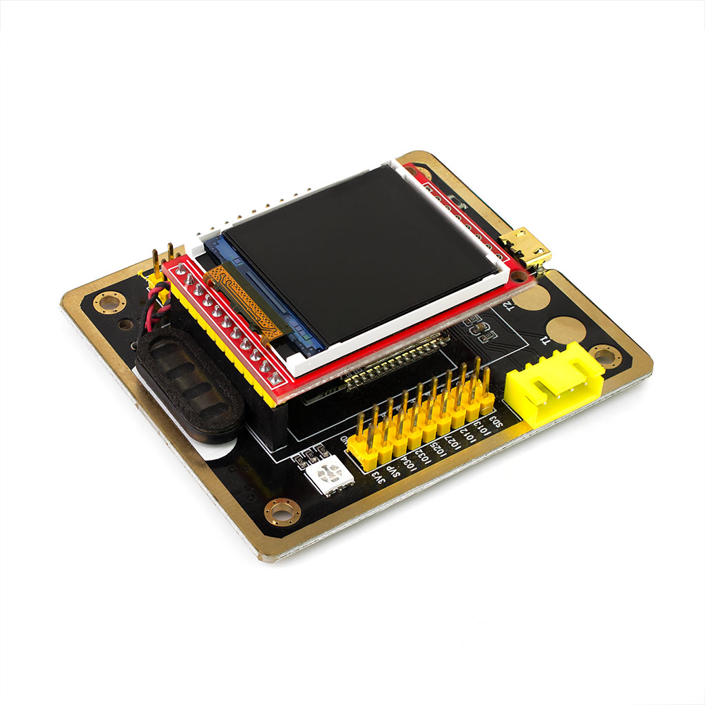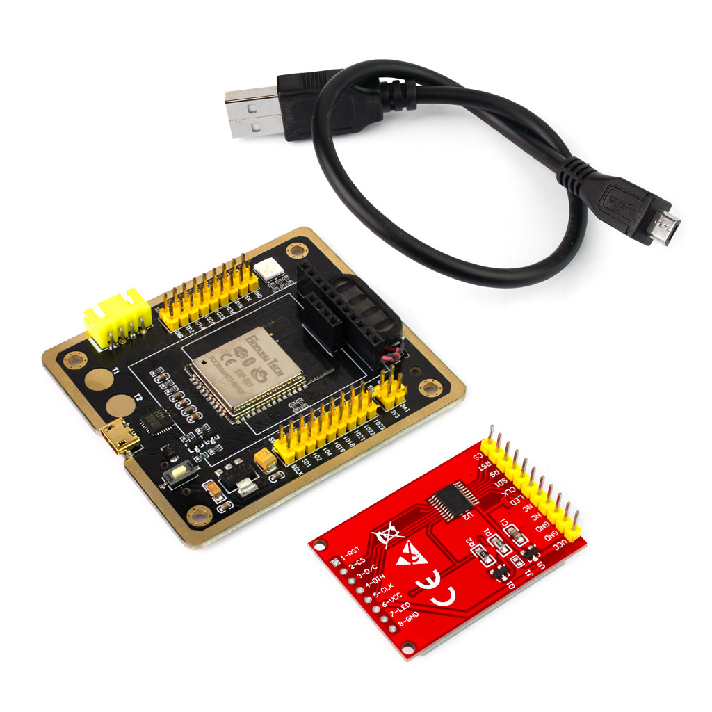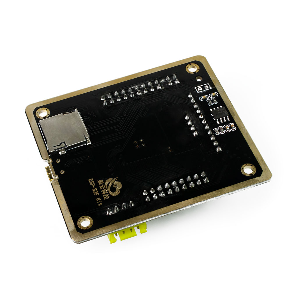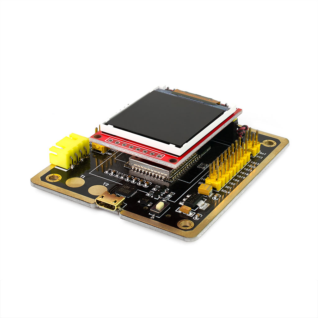 Модуль разработчика ESP-32F на чипе ESP32-WROOM-32. Питание: 3,3-5В(USB), макс.ток 500мА. Поддержка WiFi и Bluetootrh 4.2 BLE. Встроены: USB/TTL конвертер на чипе CP2102, SMD RGB светодиод, аудиоусилитель P8302A с микродинамиком, слот под microSD. В комплекте с TFT LCD дисплеем 1,44" 128х128 точек на контроллере ST7735 и USB кабелем. Размеры: 70х60мм.