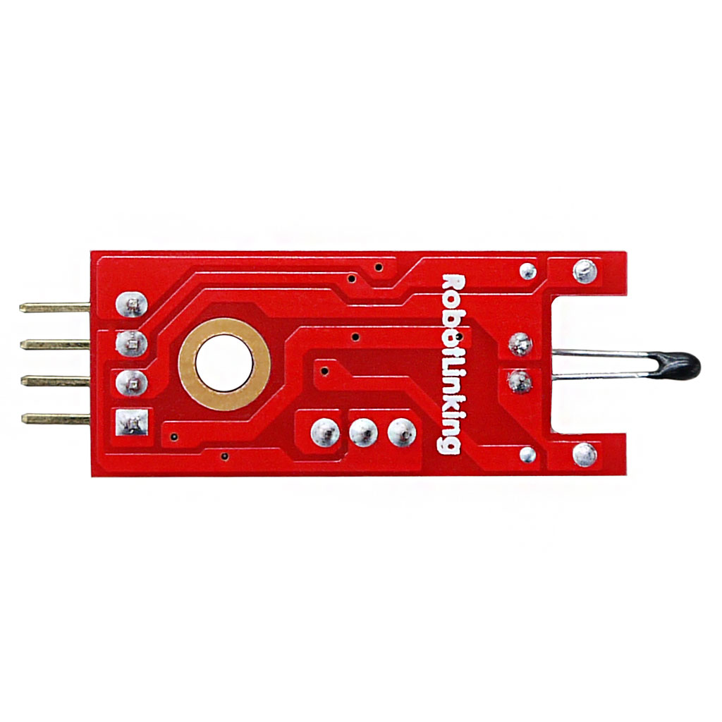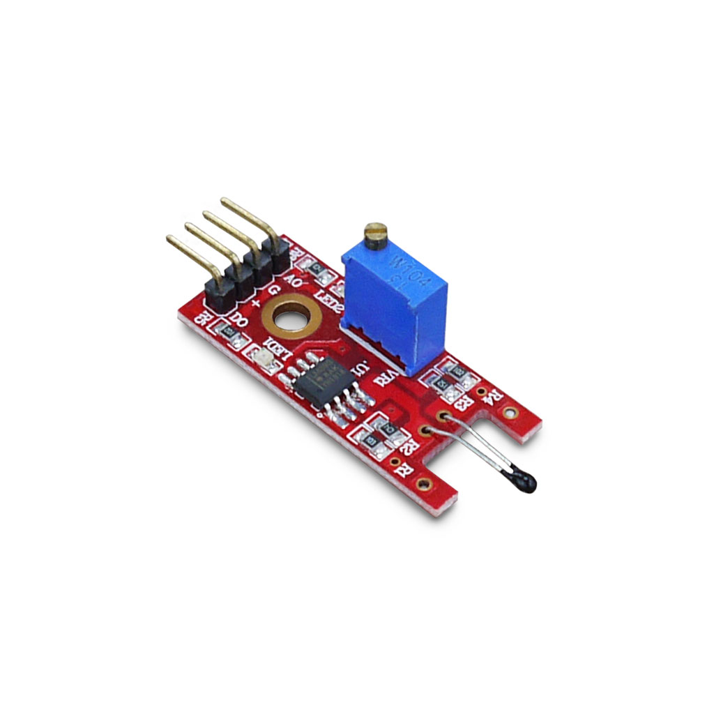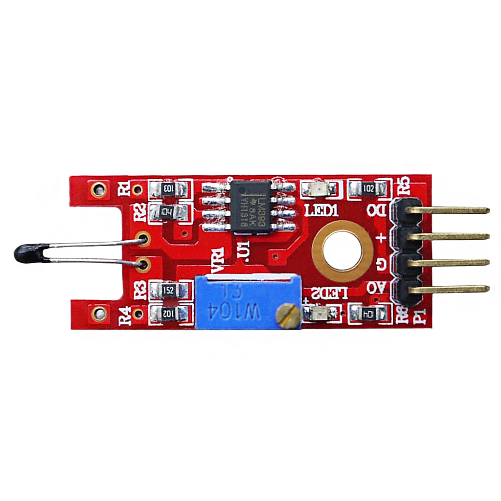 Датчик температуры с терморезистором (10 кОм с отрицательным ТКСН) и с компаратором. Момент изменения логического состояния компаратора можно регулировать подстроечным резистором, тем самым регулируя температуру срабатывания. Светодиодная индикация срабат