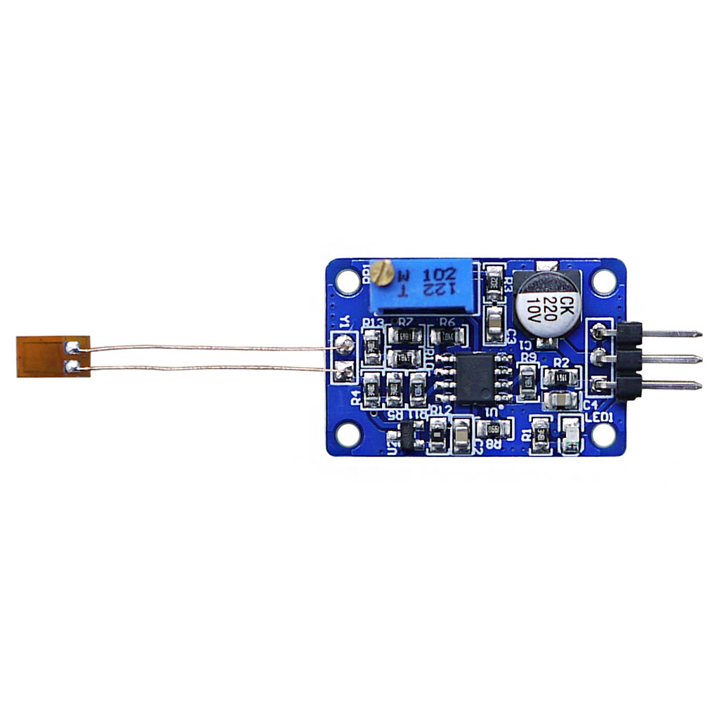 Датчик надавливания (Тензорезистор) с модулем управления основан на эффекте деформации металла под действием внешних сил. Модуль использует тензометрический датчик BF350-3AA для обнаружения деформации, с усилителем и потенциометром на плате для регулировки измеренных результатов.