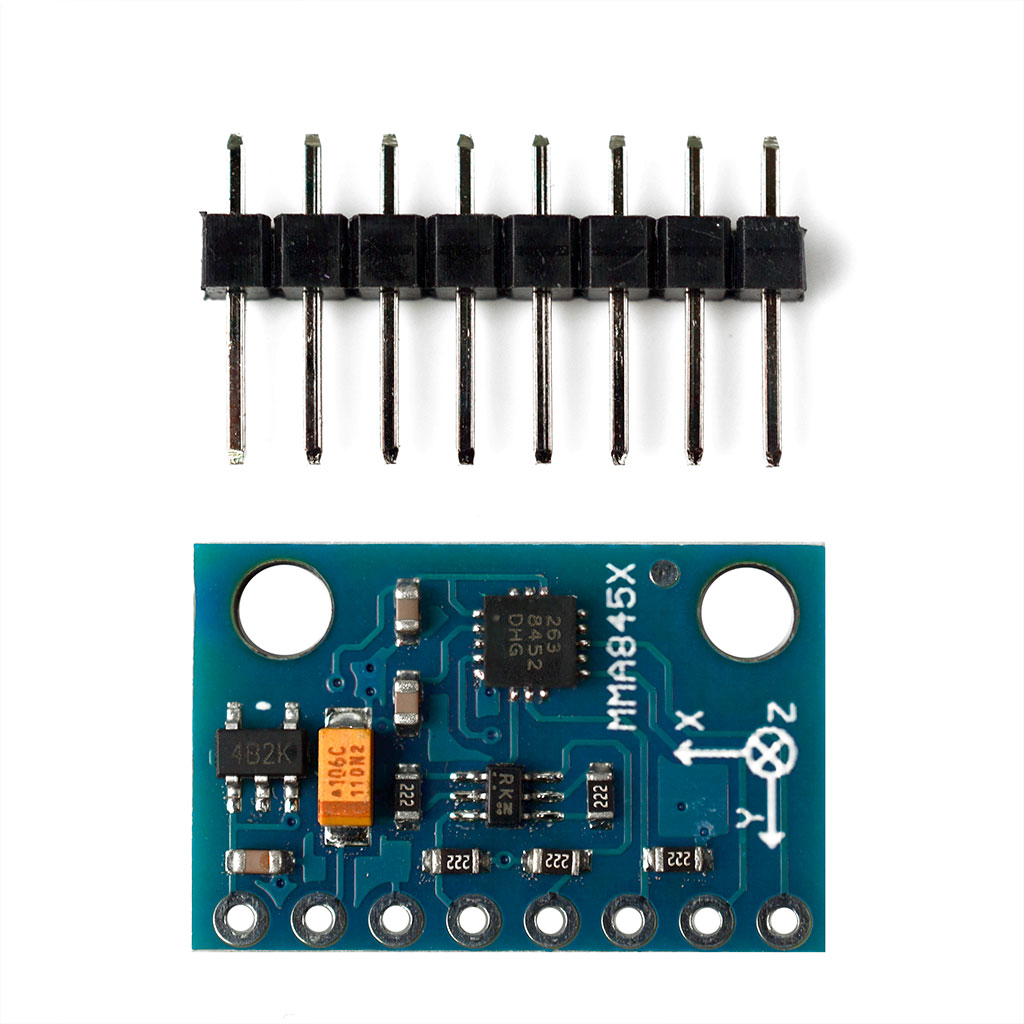 Акселерометр трехосевой GY-45 на чипе MMA8452. Определение свободного падения, пульсации и вибрации. Интерфейс обмена: I2C, Формат данных: 12 бит. Два программируемых вывода прерываний для шести источников, спящий режим. Частоты выходных данных: 1,56-800