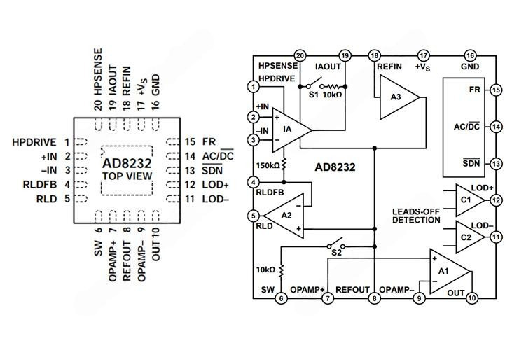 Структурная схема и распиновка микросхемы AD8232: