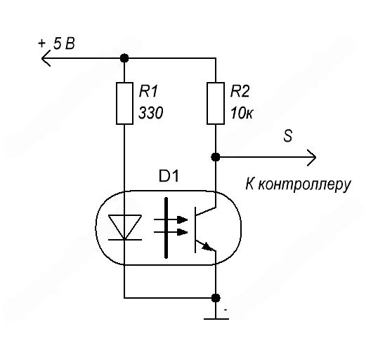 Резистор R1 ограничивает рабочий ток светодиода датчика. Резистор R2 подтягивающий, он создает положительный потенциал на выводе S когда транзистор закрыт, и не создает замыкания к выводу +5 В при открытом транзисторе. Итак, при включении модуля и подаче питания - на светодиод подается напряжение, он начинает излучать свет, фототранзистор освещается этим светом и открывается, то есть по сути прижимает вывод S к минусу питания - что свидетельствует о наличии логического 0 на выводе S. Далее мы создали препятствие между светодиодом и фототранзистором любым не прозрачным предметом. Фототранзистор закрывается его сопротивление становится огромным - и на выводе S устанавливается потенциал + 5 В - это логическая 1.