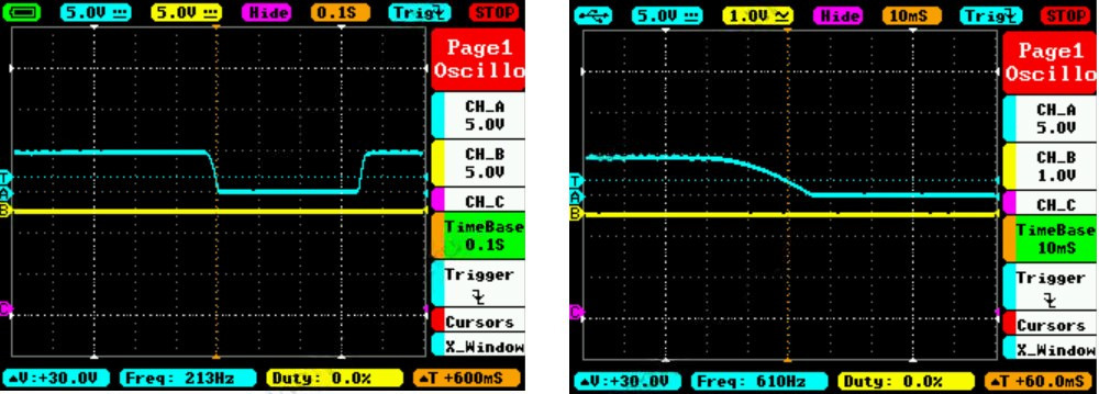 Так же прилагаю осциллограммы переходных процессов снятые с выхода датчика с контакта S. Как вы можете видеть - дребезга нет, но при 10мс становится видно что переходной процесс имеется, именно поэтому я всё таки добавил небольшую задержу в моем коде, чтобы переходные процессы не влияли на стабильность.