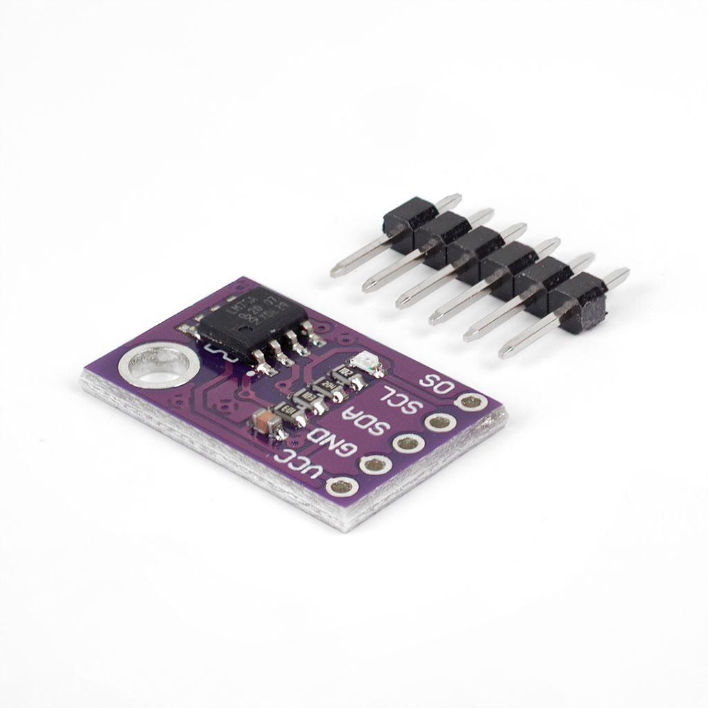 Датчик температуры CJMCU-75 на чипе LM75A с возможностью подключения дополнительных датчиков, интерфейс обмена: I2C, измеряемая температура -55-+125 гр.С, настраиваемый диапазон измерений и гистерезис, питание: 2.5-5 В, размер: 9*20 мм.