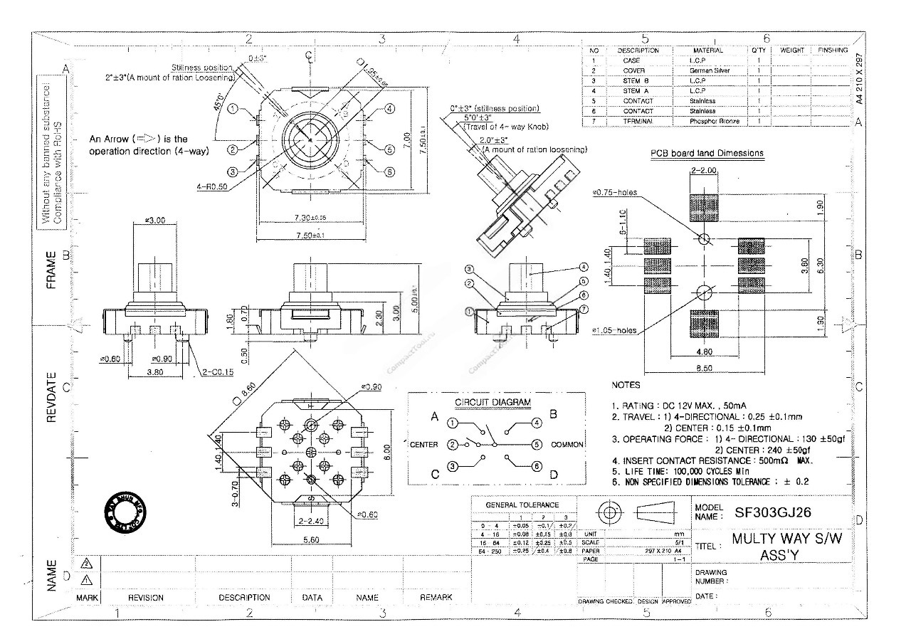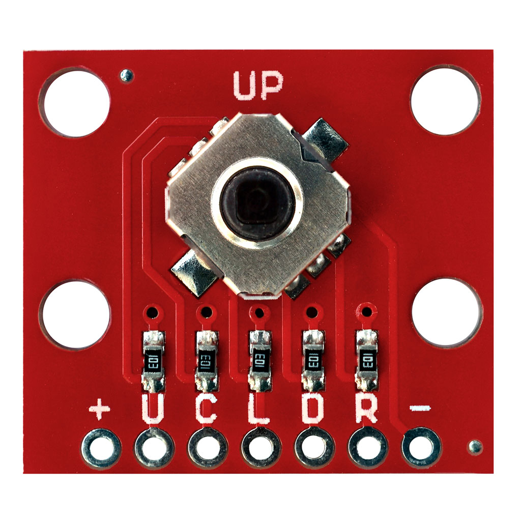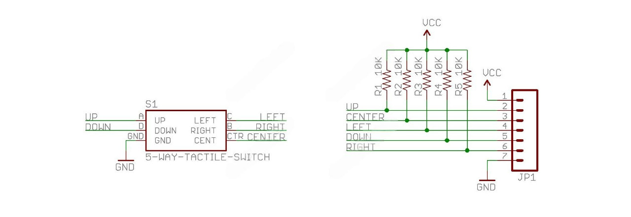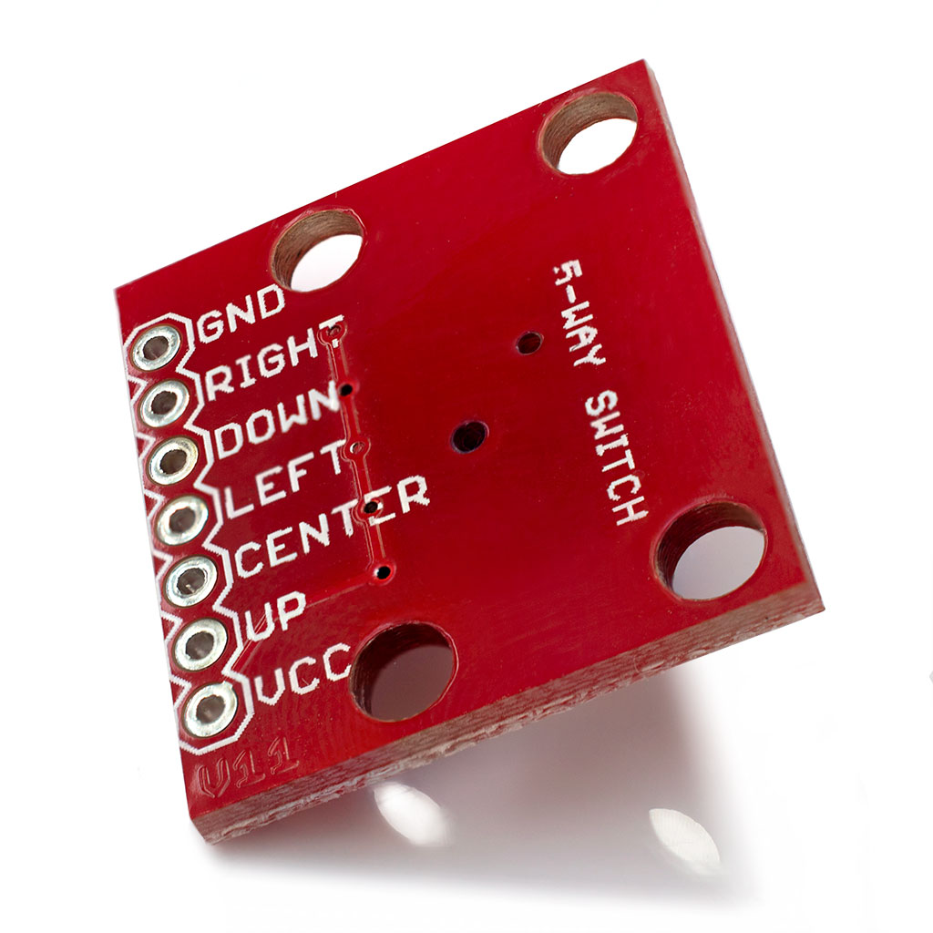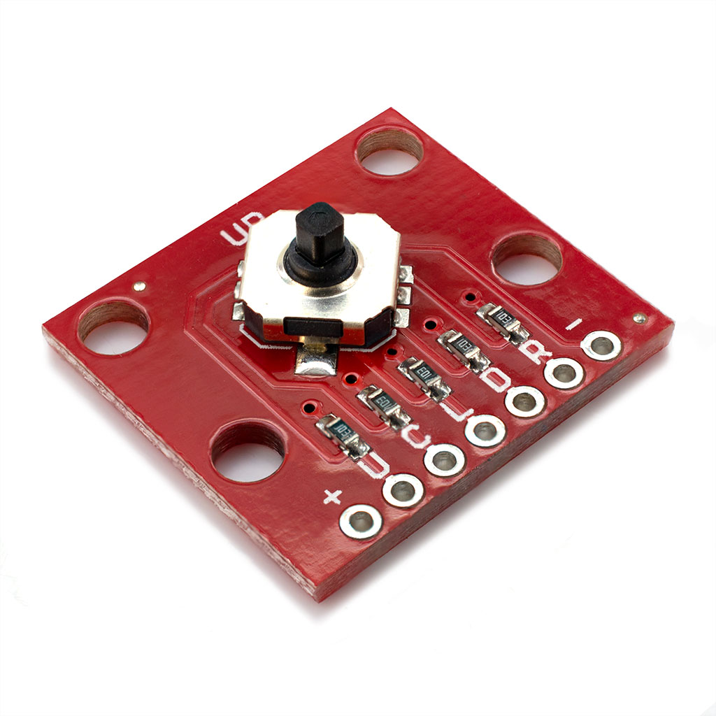 Джойстик тактильный 5-направленный миниатюрный. Предназначен для замены пяти отдельно установленных кнопок. На плату установлены подтягивающие к положительному полюсу питания резисторы (Pull Up), соответственно при нажатии на выход подается отрицательный сигнал (логический 0).