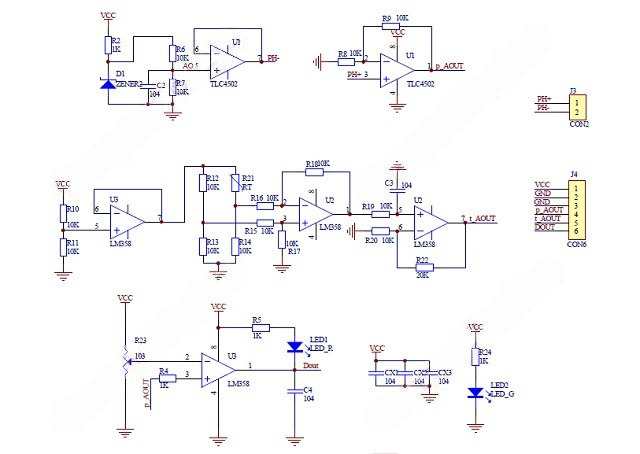 рН-сенсор можно представить в виде химического источника тока, напряжение и полярность которого зависят от показателя рН измеряемой среды и изменяются линейно. Зачастую при рН=7 напряжение на выходе сенсора равно 0 вольт, на каждую единицу рН напряжение на выходе меняется на 59,16 мВ (это число называют мВ/рН фактор) при 25°C. Это теоретическое расчитанное значение мВ/рН фактора, оно может отличаться от сенсора к сенсору и изменяется при изменении температуры (составляет 54,2 мВ при 0°C, 59,16 мВ при 25°C и 64,1 мВ при 50°C). По приведенным данным можно считать что мВ/рН фактор изменяется при изменении температуры линейно, изменяется примерно на 0,2 мВ на один градус, что позволяет корректировать его значение программно. Для измерения температуры на печатной плате предусмотрен датчик температуры.