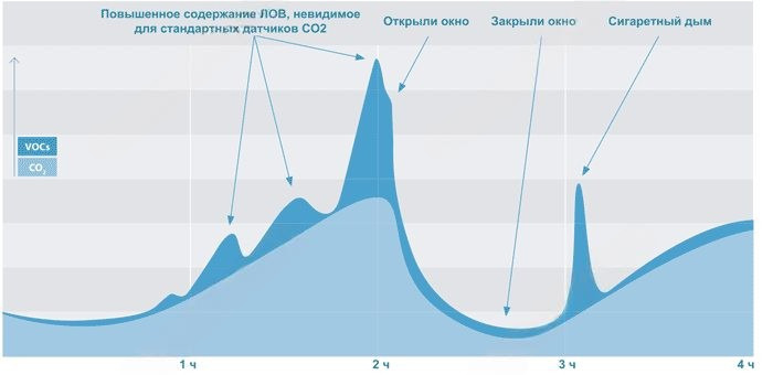 Источниками ЛОВ являются огромное количество веществ, например, стройматериалы (фанера, ЛДСП, линолеум, обои, лакокрасочные покрытия и клеи), бытовая химия (чистящие средства, ароматизаторы, парфюмерия), продукты горения (как от газовых плит, так и от сигарет и их заменителей), продукты питания (особенно те, что имеют сильный аромат) и даже человек (дыхание, потовыделение и выделения других желез). Именно из-за того, что человек тоже является источником ЛОВ, концентрацию ЛОВ часто связывают с концентрацией СО2, и измеряя содержание СО2 в воздухе делают косвенный вывод о содержании в воздухе ЛОВ. Такой подход в измерении ЛОВ оправдан дешевизной, но у него недостаточна точность измерения. Дело в том, что высокоточные датчики концентрации ЛОВ дороги для бытового применения, и косвенный способ измерения ЛОВ посредством измерения СО2 оправдан в бытовых условиях. Тем не менее, концентрация ЛОВ в воздухе зачастую не связана с концентрацией СО2, что отражено, например, на следующем графике.