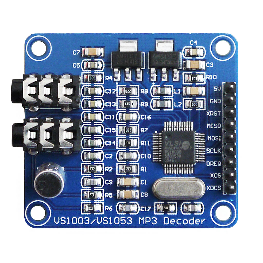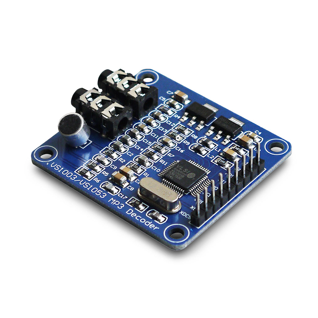 Модуль декодирования MP3 на базе VS1003B. Частота крастала: 12.288 МГц, Декодирует форматы MP3, MP3 V, WMA, WAV, MIDI, SP-MIDI. Имеет встроенный микрофон, для осуществления записи, Разъем на стерео-наушники и аудиовыход, Интерфейс обмена: SPI, Стабилизато