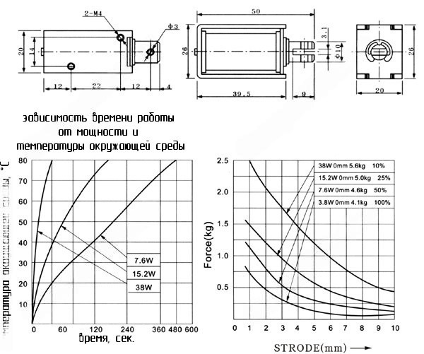 Геометрические размеры и графики зависимостей от можности.