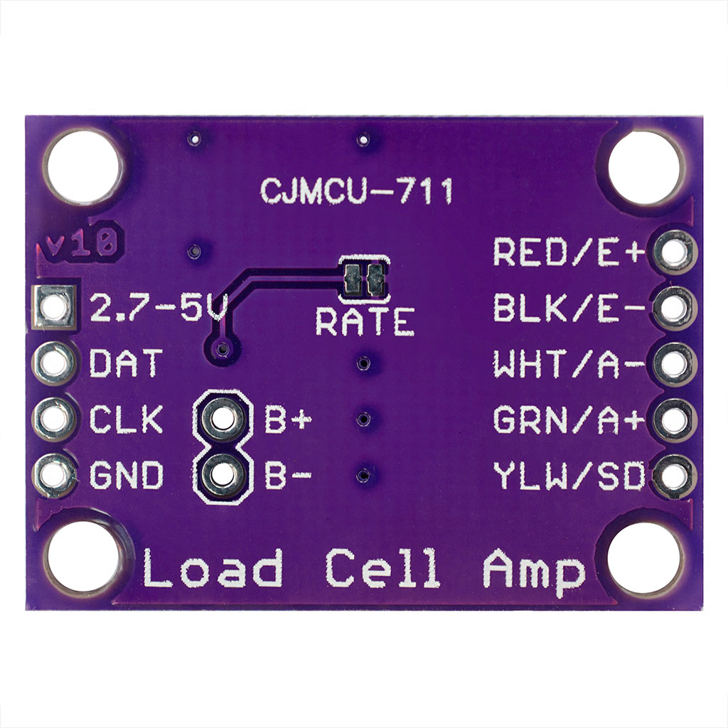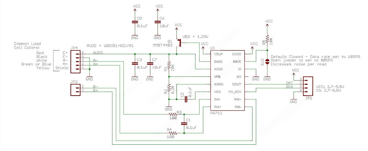 На плате предусмотрена цепь, которая обеспечивает стабильное питание для моста Уитстона. И хотя указано рабочее напряжение микросхемы 2,7-5,5 вольт, стабильные значения питания тензодатчика допустимы только при напряжении 5 вольт.