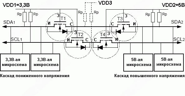 Восемь каналов позволяют подключать устройства с параллельным 8-битным интерфейсом, либо использовать один преобразователь уровня для I2C и SPI интерфейсов одновременно.