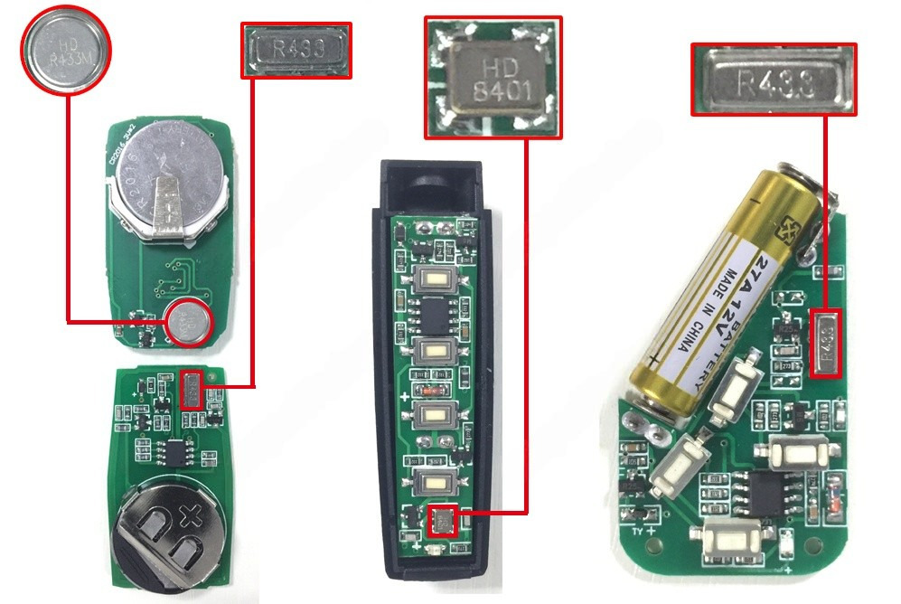 Внимание! Частота беспроводного сигнала оригинального пульта ДУ и брелка-дубликатора должна совпадать (433.92 МГц). Примеры, как определить рабочую частоту оригинального пульта ДУ на изображении:
