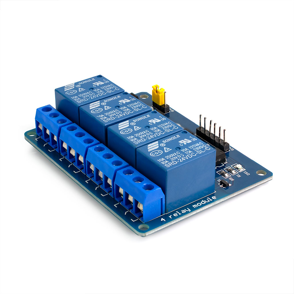 Модуль реле на 4 канала с опторазвязкой. Обеспечивает более защищенное управление нагрузкой. Питание 24 В.